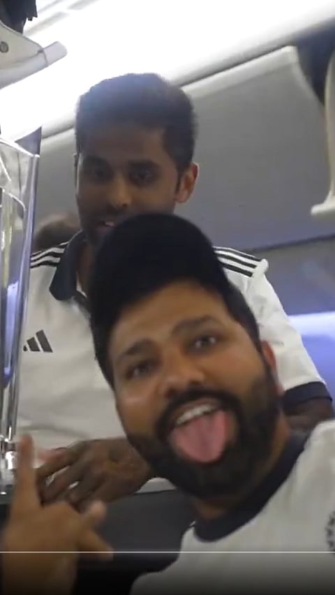 Captain Rohit Sharma celebrate with Suryakumar Yadav with the T20 World Cup trophy in the plane.