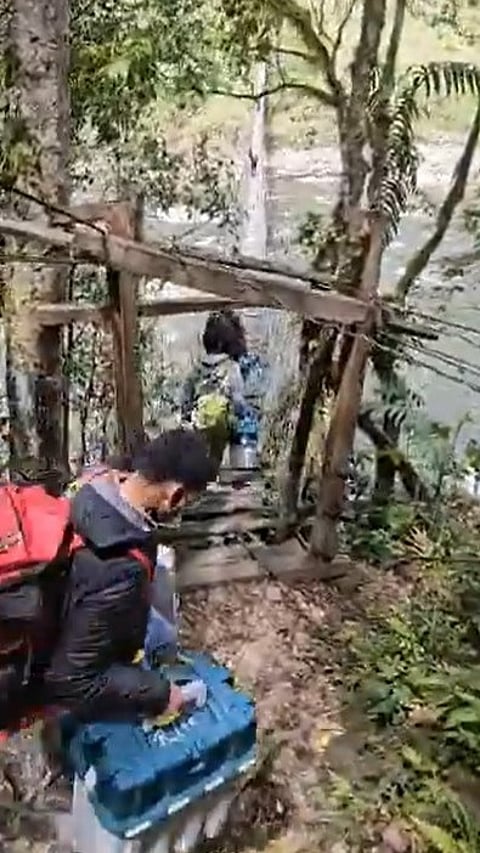 Polling team navigating the stunning hanging bridge of Lower Heyo, Arunachal Pradesh