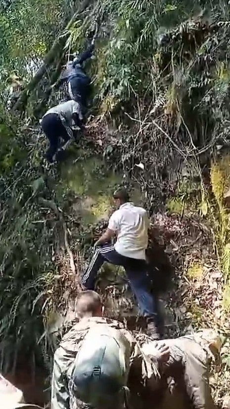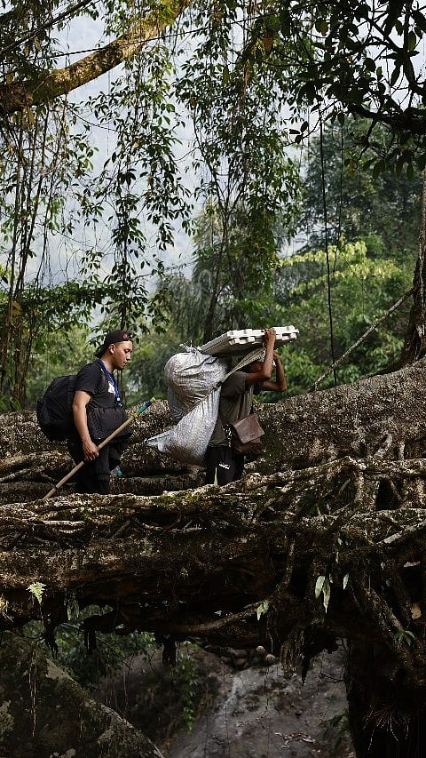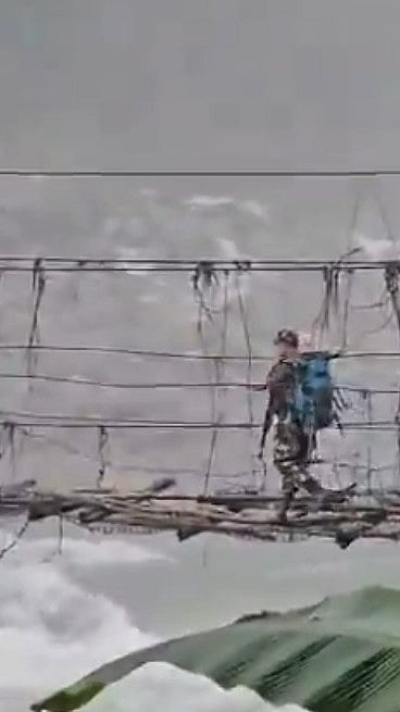 Female police personnel returning by crossing the mighty Kameng river through the traditional bamboo bridge in East Kameng after conducting polling.