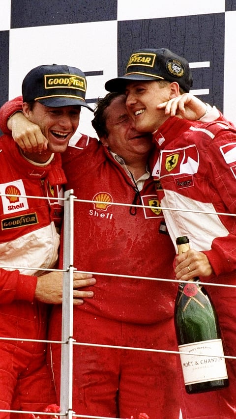 The photo of Ferrari's legends Michael Schumacher who won the race and Eddie Irvine who finished second at the podium of 1998 British Grand Prix.