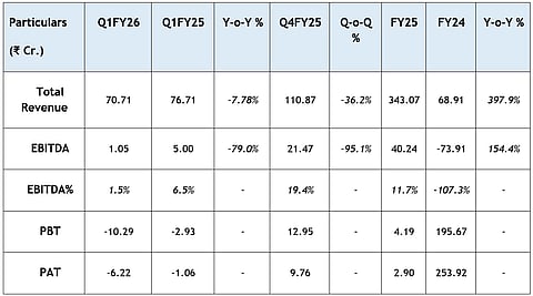 Q1FY26 Total Revenue at ₹70.71 crores with positive EBITDA of ₹1.05 crores