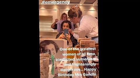Kangana also shared a picture of herself from her make-up session in her stories. In the picture, one can also see an image of Indira Gandhi placed next to the mirror for make-up reference.