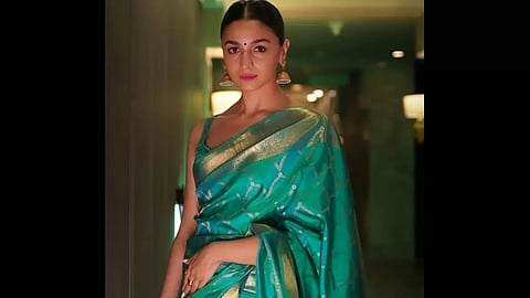 Alia Bhatt's approach to the Kanchipuram saree is minimalistic and chic. She elegantly drapes herself in a teal green saree and pairs it with oversized jhumkas