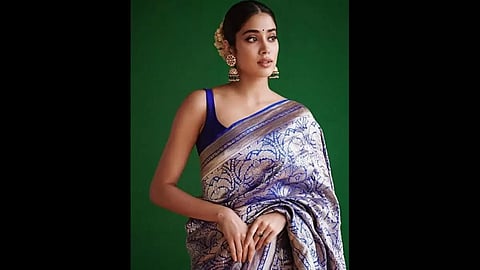 Janhvi Kapoor exudes elegance in a vibrant blue Kanchipuram saree. Adorned with a floral garland placed in her hair. Janhvi pairs the saree with statement jhumkas that add a touch of traditional glamour.