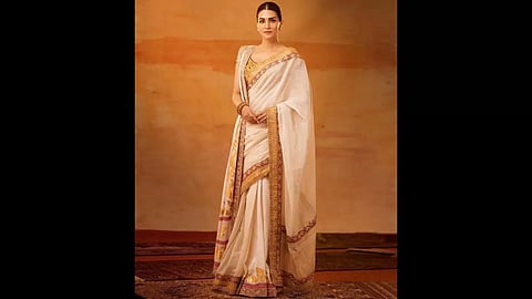 Kriti Sanon opts for an elegant white Kanchipuram saree with red detailing. The addition of a gajra in her hair adds a traditional touch to the ensemble, evoking a sense of timeless charm.