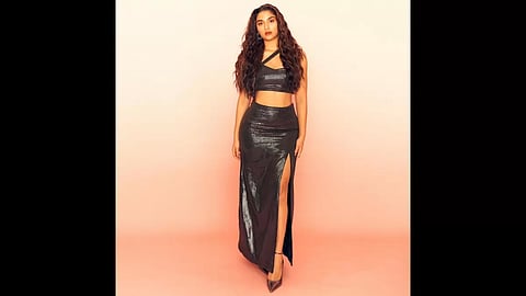 Saiee M Manjrekar redefined glamour in a black shimmery co-ord set, complete with a thigh-high slit, and perfectly paired with metallic heels.
