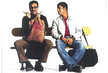 If Modern Times was a critique of industrial modernity, Anbey Sivam pretends to be critical of globalisation and MNCs (though Madhavan appears in a scene with his Pepsi loyalty intact). Lines that would figure in a CPI(M) pamphlet (or a Swadeshi Jagaran Manch's) are strewn all over the film. The film begins in a flooded Bhubaneshwar where Anbarasu (Madhavan), an ad filmmaker, and Nalla Sivam (Kamal) run into each other. Orissa is cut off from the rest of the country and Anbarasu needs to make it to Chennai in four days for his wedding. Instead, he is trapped with an idiosyncratic Sivam, with whom he is forced to share a room, rides on (not in) buses, and in trains, besides meandering conversations. There's good chemistry between Kamal and Madhavan, unintended perhaps. Like hero-heroine (in DDLJ) they run into each other as strangers, heroine can't stand the harassing hero, but eventually is attracted and falls for him. Anbarasu and Sivam even sing a duet as the Orissa flood becomes a cruelly picturesque prop for Kamal to philosophise on life, love, god, a/theism, fate. In the process, we learn through flashbacks about Kamal's past: when his face is not disfigured (it otherwise is), his limbs are in shape (they otherwise are not), and he is a street theatre activist, painter, plus organiser of workers against an oppressive capitalist (played by Nazar) whose daughter (Kiran) he falls in love with. Villainous father hates poor unionist, separates the two. Flashback dissolves into the present as a stone disturbs the still waters, literally.