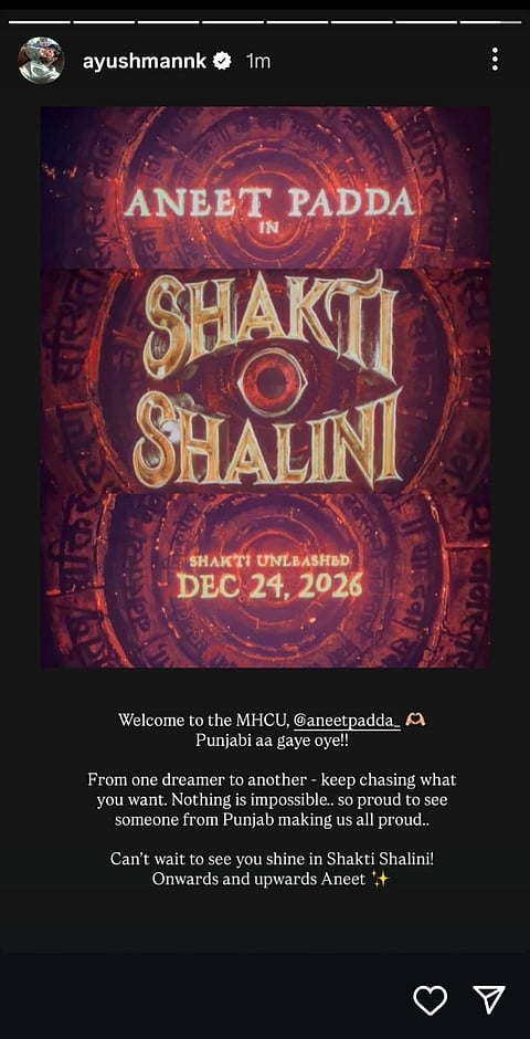Khurrana, sharing a special message for Padda, wrote on his Instagram story, "Welcome to the MHCU, @aneetpadda_ 🫶 Punjabi aa gaye oye!! From one dreamer to another - keep chasing what you want. Nothing is impossible.. so proud to see someone from Punjab making us all proud.. Can’t wait to see you shine in Shakti Shalini! Onwards and upwards Aneet ✨(sic)".