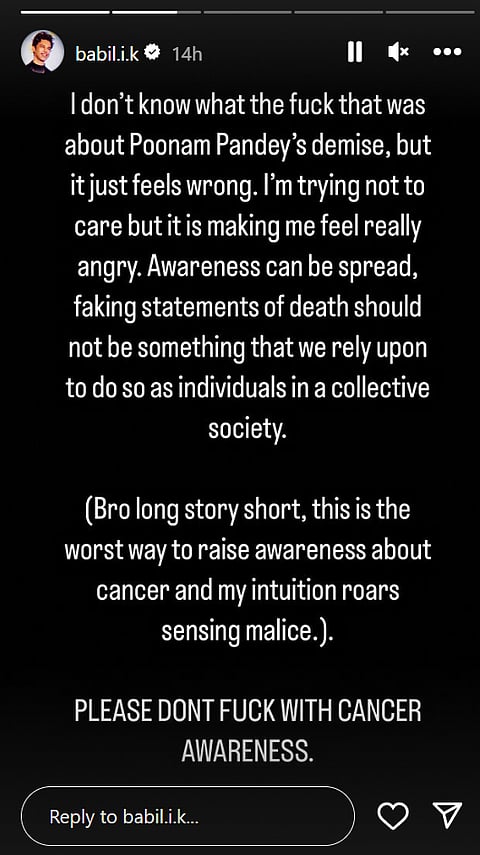Poonam Pandey has taken the world by storm. The actor faked her death in order to raise awareness about cervical cancer. Her actions have been condemned by many stars from the industry. The latest Bollywood actor to call her out is Babil Khan. The ‘Qala’ actor penned a note where he condemned her publicity stunt.