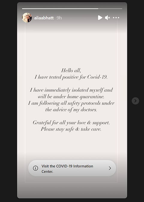 Bollywood actor Alia Bhatt on Friday informed her fans that she has tested positive for Covid-19 and is under home quarantine.