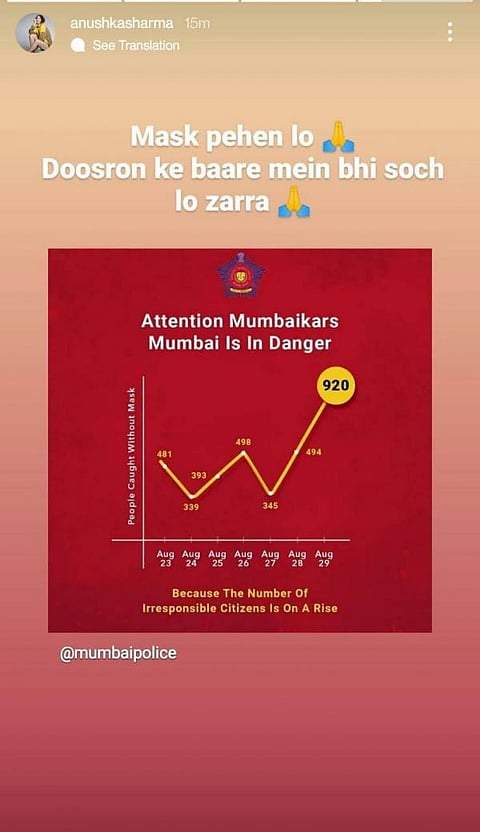 Actor Anushka Sharma shared the post, via Insta Stories and wrote, “Mask Pehan Lo. Doosron Ke Baare Mein Bhi Soch Lo Zara (Please Wear A Mas. Think about others)”.