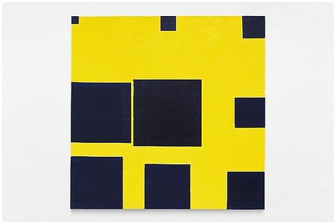 (Untitled (ivory black on cadmium yellow, nine square progressions around the edges), 2019 by Paul Mogensen | Courtesy of the artist and Blum & Poe, Los Angeles/New York/Tokyo )