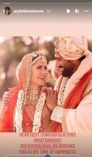 However, Salman Khan's sister Arpita Khan's heartfelt wish for friend Katrina Kaif stands out. Arpita Khan and her brother were not seen at the wedding, but she took to Instagram stories to wish Kaif through a warm message.