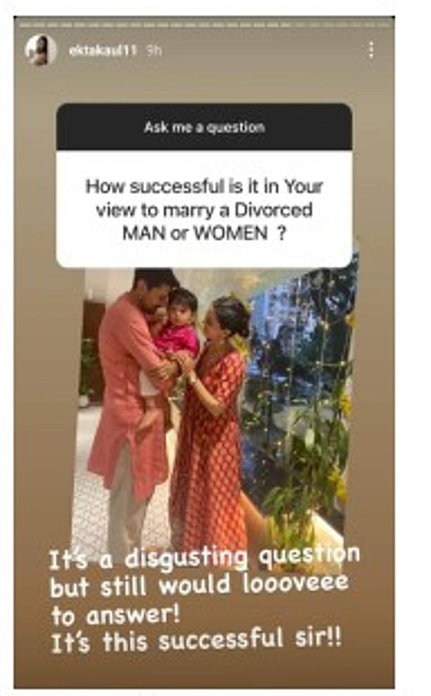 Television actress Ekta Kaul, wife of actor Sumeet Vyas, held a ask me anything session on Instagram. During the session, she was asked about the 'success' of marrying a divorced man. Calling out the question as 'disgusting' she gave a befitting reply to the fan.