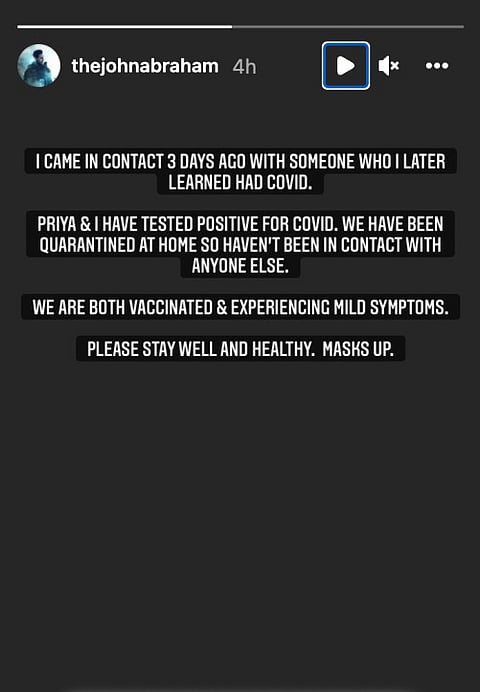 Actor-producer John Abraham and his wife Priya Runchal tested positive for Covid-19 on Monday. They are being quarantined at their house. Abraham shared the news on Instagram Stories, revealing that he met a Covid positive individual three days earlier.
