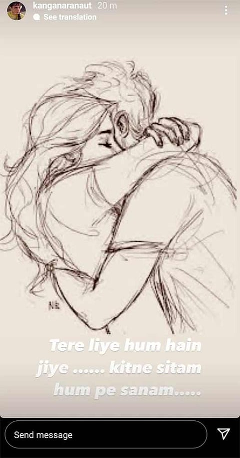 Bollywood star Kangana Ranaut posted a secret message on her Instagram story, leaving fans to wonder if everything is fine with the actress. Ranaut shared a pencil sketch of a woman hugging a man on Monday. She captioned the sketch, "Tere liye hum hain jiye... kitne hum pe sanam... (If I've lived for you, why am I being treated so unfairly?)."
