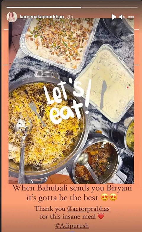 Bollywood actress Kareena Kapoor Khan took to Instagram on Sunday, and shared picture of the biryani sent by actor Prabhas, who is currently working with Kareena’s husband, actor Saif Ali Khan for the upcoming film ‘Adipurush’.