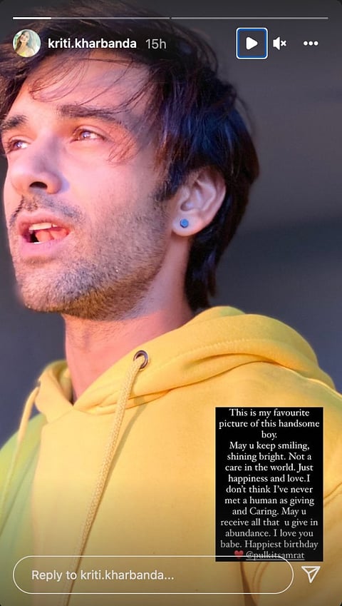 The 'Karwaan' actress also shared a photo of Samrat with a sweet comment on her Instagram stories. She wrote, "This is my favorite picture of this handsome boy. May u keep smiling, shining bright. Not a care in the world. Just happiness and love. I don't think I've never met a human as giving and caring. May u receive all that u give in abundance. I love you, babe. Happiest birthday @pulkitsamrat" along with a red heart emoji.