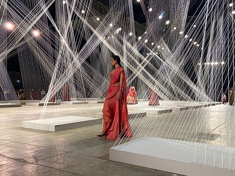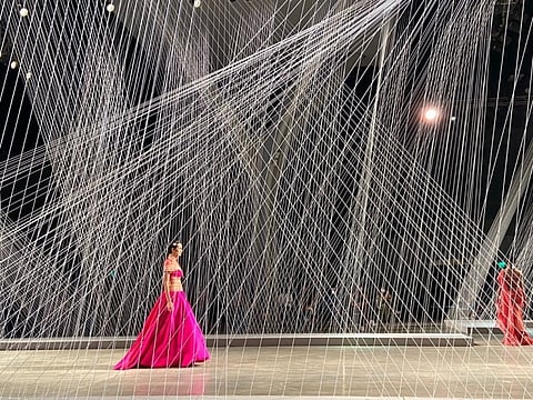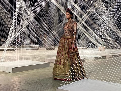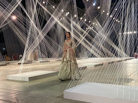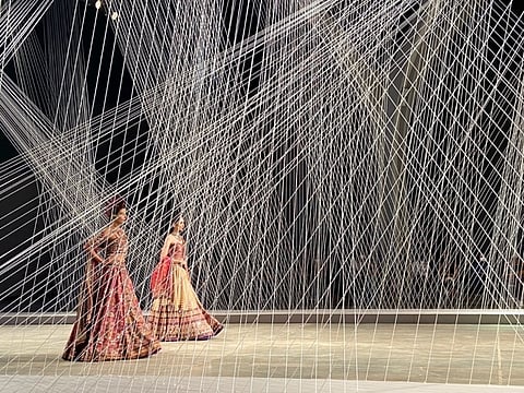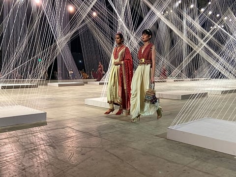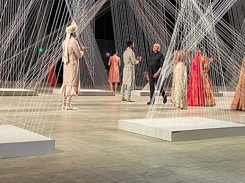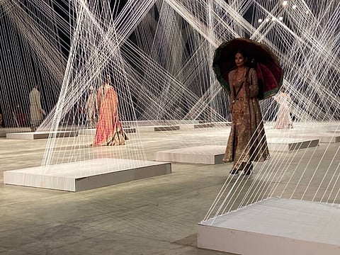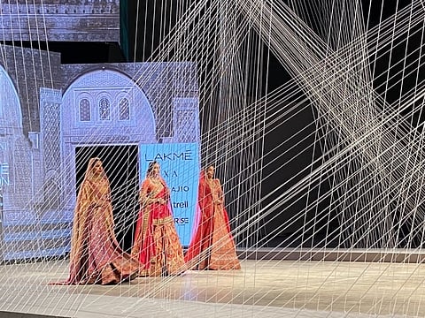 As we got deeper and deeper into the worldwide pandemic, many among us began to realise that the idea of 'physical' changed forever. There was no going back to the old notions of experiencing anything physically in the same fashion that we were accustomed to for many reasons and habits. As I reached the Lakme Fashion Week 2021 venue for its first physical runway show featuring designer Tarun Tahiliani's Autumn-Winter '21 collection called "The Reunion" celebrating fashion and togetherness, it finally hit me that I was physically present at a fashion event after a long time as yearly fashion week ritual had gone virtual in the last couple of years. The happily murmuring attendees hiding their overexcitement and how glad they were to finally catch a physical fashion show , the overprotective security team and volunteers trying to keep everything in order, the faces from the management asking around if we are comfortable at the venue, some familiar faces trying to figure out if they know each other and doing the small talk at distance, it all made sense to what fashion has been needing for sometime now. That is space and structure.
