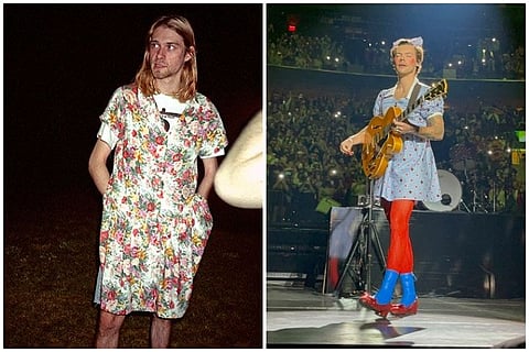 (Several musicians such as Kurt Cobain (left) and more recently Harry Styles have performed on stage wearing dresses | Credit: Twitter)