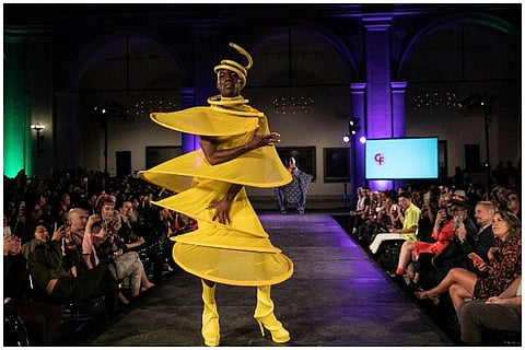 (A model showcases a dress at the DapperQ fashion show, an event dedicated to queer fashion, in 2019 | Credit: AP)