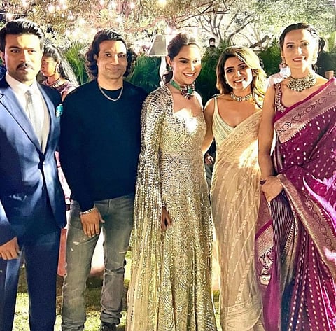 Actress Samantha Ruth Prabhu recently attended the wedding reception of Anushpala Kamineni, actor Ram Charan's sister-in-law. Prabhu posed with her friend and fashion designer Shilpa Reddy, actor Shriya Saran, and Charan and his wife Upasana Konidela for photos.