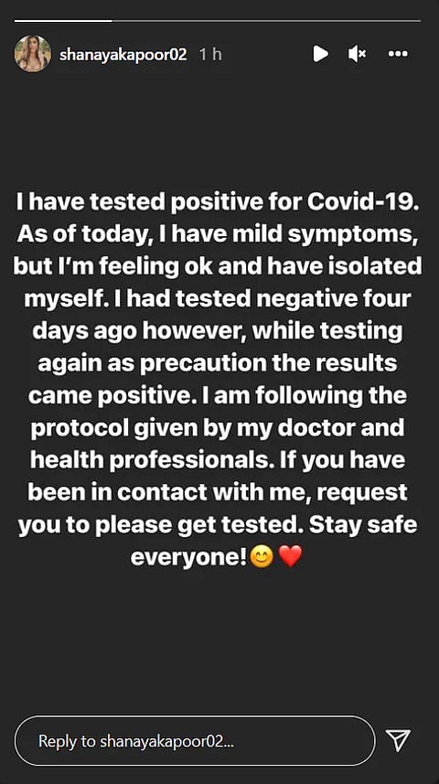 Shanaya Kapoor tested positive for Covid-19 on Wednesday, she revealed on her Instagram Stories. Her mother, Maheep Kapoor, was diagnosed with Covid-19 after attending a meal at Karan Johar's place.