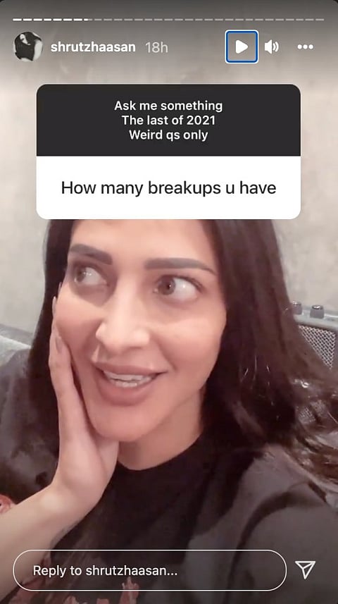 Actress Shruti Haasan has reacted to an Instagram user who inquired about the number of break-ups she had experienced. Haasan responded to the question during an Ask Me Anything (AMA) session on her Instagram.
