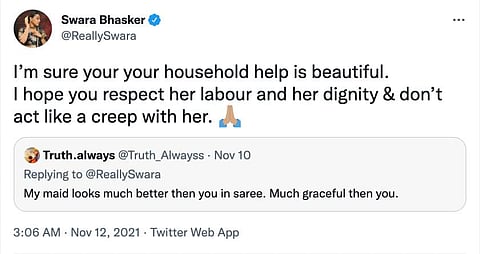 Giving a befitting reply to the person, Swara wrote, “I’m sure your household help is beautiful. I hope you respect her labour and her dignity and don’t act like a creep with her.