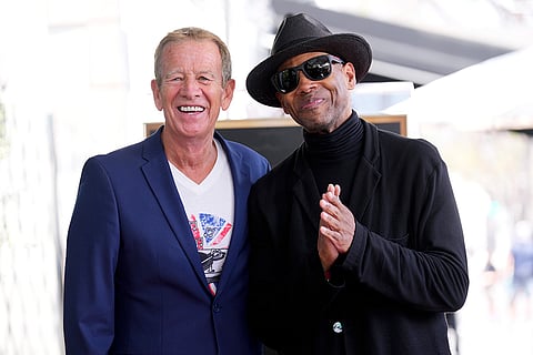 Radio personality Richard Blade, left, poses with producer Jimmy Jam during a ceremony to award Blade a star on the Hollywood Walk of Fame in Los Angeles.