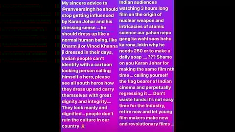 Actress Kangana Ranaut never misses a chance to slam filmmaker Karan Johar. Now, she has taken a dig at him as she criticised his movie 'Rocky Aur Rani Kii Prem Kahaani'. Alia Bhatt and Ranveer Singh starrer hit the screens on July 28. Kangana who has always been at loggerheads with Karan, in a series of her Instagram posts bashed 'RARKPK'.