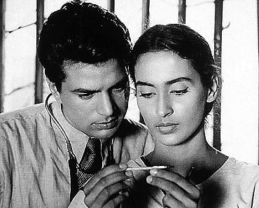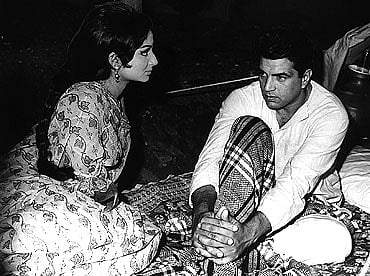 Between 1969 and 1973, Mukherjee sidelined Dharmendra to direct a series of successful films with the two main heroes of this time: Rajesh Khanna and Amitabh Bachchan, the reigning superstar and his successor. He made Anand, Bawarchi, Abhimaan and Namak Haraam. Looking for a firm foothold in the souffle cinema of the '60s, Mukherjee tried to slide past love stories and their tree-hugging conventions by making movies about all-male love. By framing Rajesh Khanna's awesome capacity for self-love in stories of male bonding with tragic resolutions (Anand, Namak Haraam), Mukherjee managed to transmute Khanna's narcissism into charm, his sickly appetite for suffering into twinkling endurance.