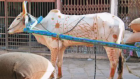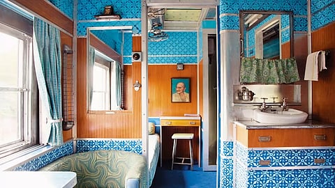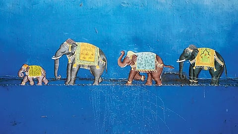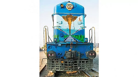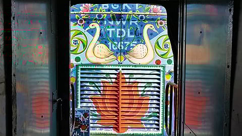 More than a hundred artists—truck painters, stencil artists, miniaturists, lettering painters— worked on the exterior and interiors of the train. A bull with mehendi designs. Inspired while driving in Rajasthan.