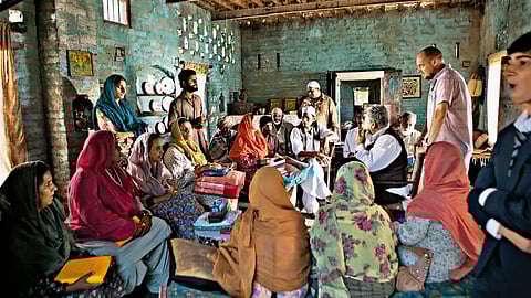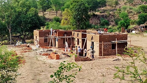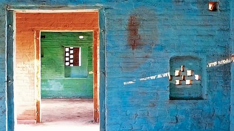 The house that Khan built in the Pakistani countryside. Jayanti Majri on the outskirts of Chandigarh. Built in brick. Aged by the monsoon. Two colours in brick were frayed as a relief. Night exterior, Day interior