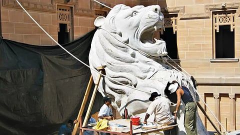One Night With The King is set in biblical times. Before light and glass. I designed the winged lion, pillars and griffins for the throne room. To impose and awe. I worked with 80 moulders to make it. Made in Mumbai, we cut it all up and drove them down in 11 trucks to Jodhpur and reassembled it on site. Painted and installed them to harmonise with the Umaid Bhawan