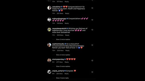 Actress Mouni Roy said, “Oh my god…..congratulations beautiful humans” with a series of red hearts. Actress Gauhar Khan and badminton player Sania Mirza also congratulated the couple. Bhatt’s best friend and actress Akansha Ranjan Kapoor showered her love with red hearts and dancing girl emojis.