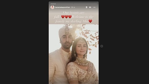 Actress Kareena Kapoor Khan, Ranbir Kapoor's cousin, took to her Instagram story and said, 'Our hearts are full, welcome to the family darling Alia'.