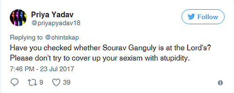 The tweet attracted several reactions, One user commented on his tweet saying, “You said Sourav’s act, and that time he was captain, please don’t mind but sir please think twice before tweeting anything.” While another user reacted with, “Have you checked whether Sourav Ganguly is the Lord’s? Please don’t try to cover up your sexism with stupidity.”