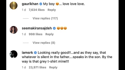 Shah Rukh wrote: "Looking really good!!...and as they say, that whatever is silent in the father....speaks in the son."