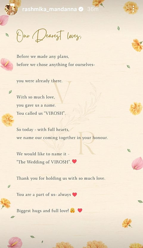 They shared a personal note on Instagram Stories that read: “Our Dearest loves, Before we made any plans, before we chose anything for ourselves— you were already there. With so much love, you gave us a name. You called us ‘VIROSH’. So today — with full hearts, we name our coming together in your honour. We would like to name it — ‘The Wedding of VIROSH’. Thank you for holding us with so much love. You are a part of us — always. Biggest hugs and full love! (sic)”