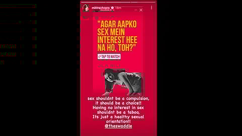 Meera Chopra took to her Instagram story and wrote, "Sex shouldn't be a compulsion, it should be a choice! Having no interest in sex shouldn't be a taboo, it's just a healthy sexual orientation (sic)."