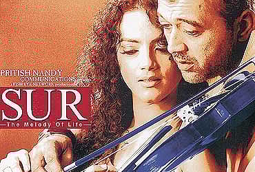 Orchestral manoeuvres in Ooty is what this film directed by Tanuja Chandra and produced by Pooja Bhatt is all about. Being trumpeted in the movie market as "the melody of life", Sur shows Chandra breaking off from her Dushman and Sanghursh evil-obsessions. Here she composes a simple, musical script, which debuts soulful singer Lucky Ali (of O Sanam fame) and small-screen actress Gauri Karnik. Playing Svengali and Prof Higgins all at once, Lucky Ali as Vikramaditya Singh is a maestro who gets struck by Gauri Karnik, 'Tina Maria' singing Ave Maria in a church in Goa. And before you can say amen, he transports her to Sur, his school of music in Ooty hoping to bequeath her with his musical legacy. Sequestered in the green Nilgiri hills, Tina joins other students who do their daily workout on violins. Plenty of Vanessa Mae moments here like when Tina, who can't read a score, fits the fiddle under her chin and vibrates the bow with tremendous virtuosity.