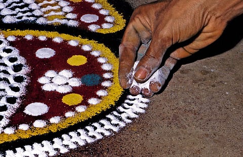 Juggling many hats comes naturally to French photographer, lecturer and Kathakali dancer Chantal Jumel, as does exploring various facets of a foreign culture. Via her photography exhibition ‘Inward Journey through Graphical India’, she pays homage to Tamil women, with whom she spent time learning the nuances of the kolam. Jumel had come to India to learn Kathakali and Mohiniattam. Along the way, she imbibed the local culture well enough to write a book, Kalam and Kolam, which delves into the ritual paintings and decorations of the south, exploring their origins, the myths surrounding them and their sensory and aesthetic appeal. Her photographs illustrate experiences with women of different communities and captures unique kolam designs. Considering that close to 25 million Tamil women are known to draw the kolam everyday, that would be a lot to choose from. Also set in rectangular frames by her is the spirit of the kalam ground paintings which form part of the tradition of the Ambalapuzha temple in Kerala. Till March 20, Dakshina Chitra