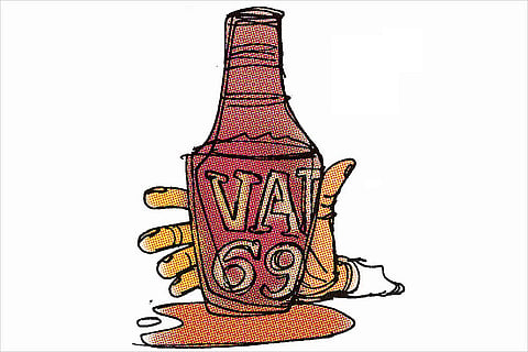 The ubiquitous VAT 69—the eternal favourite of good old baddies. No villain’s den earned respectability without this showpiece. The logo seemed to give a bigger high than the beverage itself to whoever held it aloft like a