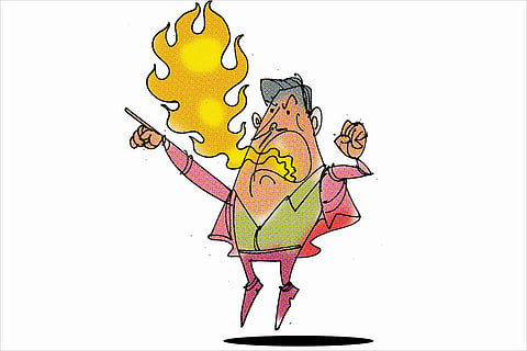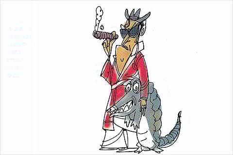 A long tunnel, colourful 15-watt bulbs flashing along the way with staccato beep sounds, leading to a villain’s den where a small pool is filled with....simmering acid. A bimbo by his side to light up his Havanas, the Big Boss was a cross between a zany scientist and a couturier’s role model.