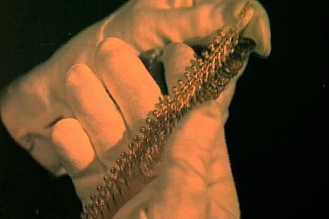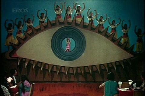 Opening sequence. Both films have terrific openings, buoyed by driving funky melodies. In Teesri Manzil, title cards are interleaved with quick scenes of the night of Roopa's deadly plummet from the titular third floor, lending a distinctly noir feel that sets the tone for a moody thriller. But Jewel Thief's title sequence is even better. It opens with a beautifully stylised presentation of the jewel thief himself, a pair of white-gloved hands roving across starkly lit displays, grabbing choice pieces out of their cases and plucking them off mannequins. Then an increasingly dramatic selection of headlines flashes across the screen – Biggest Jewel Theft in 20 Years! Police Baffled - Who is the Jewel Thief? Peheredar sote hain to Jewel Thief jaagta hai! These titles hint at the grand scale of the thief's operations and set the stage for the thrills to come.
