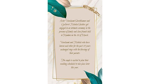 Actress Varalaxmi Sarathkumar has moved forward to open up a new chapter in her life. She has announced her engagement to art gallerist Nicholai Sachdev on March 1 in Mumbai with their loved ones around. The gorgeous pics of their beautiful engagement ceremony have taken the internet by storm and well-wishes are being poured upon the two.