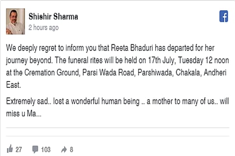 Actor Shishir Sharma took to Facebook to inform about her demise. He wrote, "We deeply regret to inform you that Reeta Bhaduri has departed for her journey beyond. The funeral rites will be held on 17th July, Tuesday 12 noon at the Cremation Ground, Parsi Wada Road, Parshiwada, Chakala, Andheri East. Extremely sad.. lost a wonderful human being .. a mother to many of us.. will miss u Ma..."