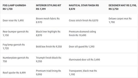 If the above accessories don’t suit your taste, you can opt from a list of chrome finished accessories like garnishes for the headlamp, fog lamp, tail lamp, rear bumper and the number plate. These bits and pieces are priced in the range of Rs 750 to Rs 3,799, which is quite acceptable for the added bling they offer.
