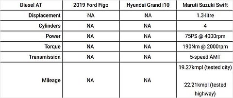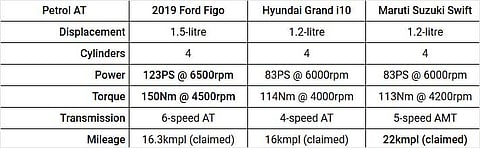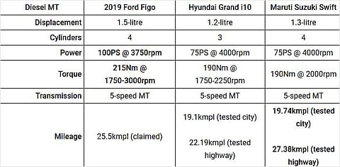 Ford has launched the new Figo facelift at prices ranging from Rs 5.15 lakh to Rs 8.05 lakh (ex-showroom Delhi). Apart from the cosmetic changes inside out, the 2019 Figo now gets two new petrol engines, new manual transmission and some new equipment too. Here’s how it compares to its main rivals in the segment - the Maruti Suzuki Swift and the Hyundai Grand i10 - on paper.